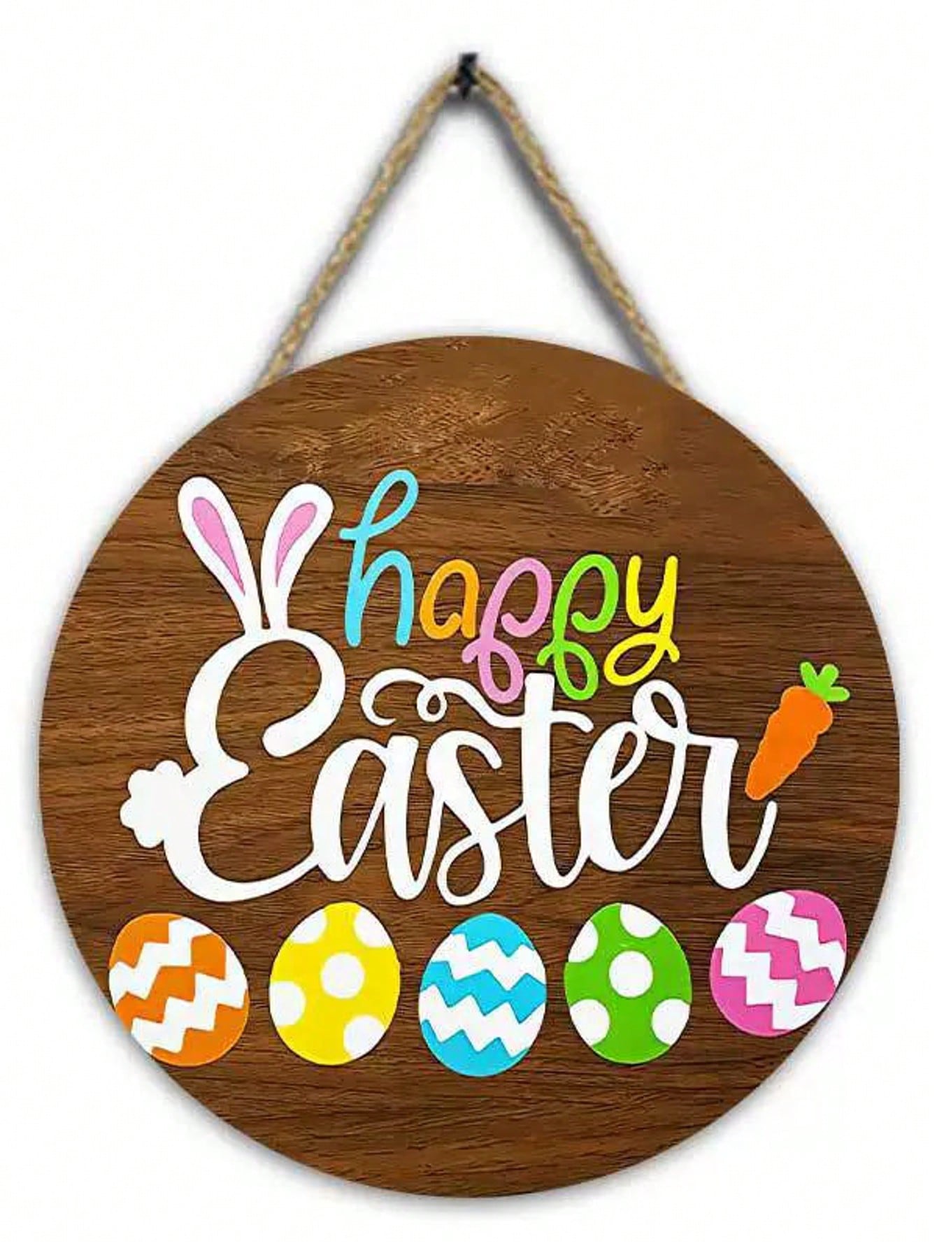Easter Bunny egg party decorations, wooden circular signs, festive atmosphere doorplates